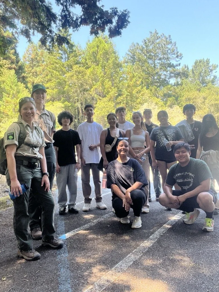 Youth participating in a guided hike of Huddart Park with San Mateo County Rangers.